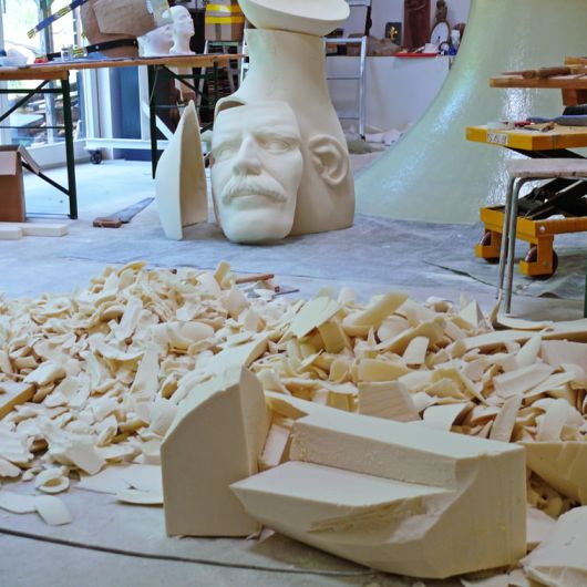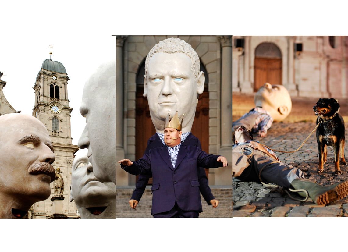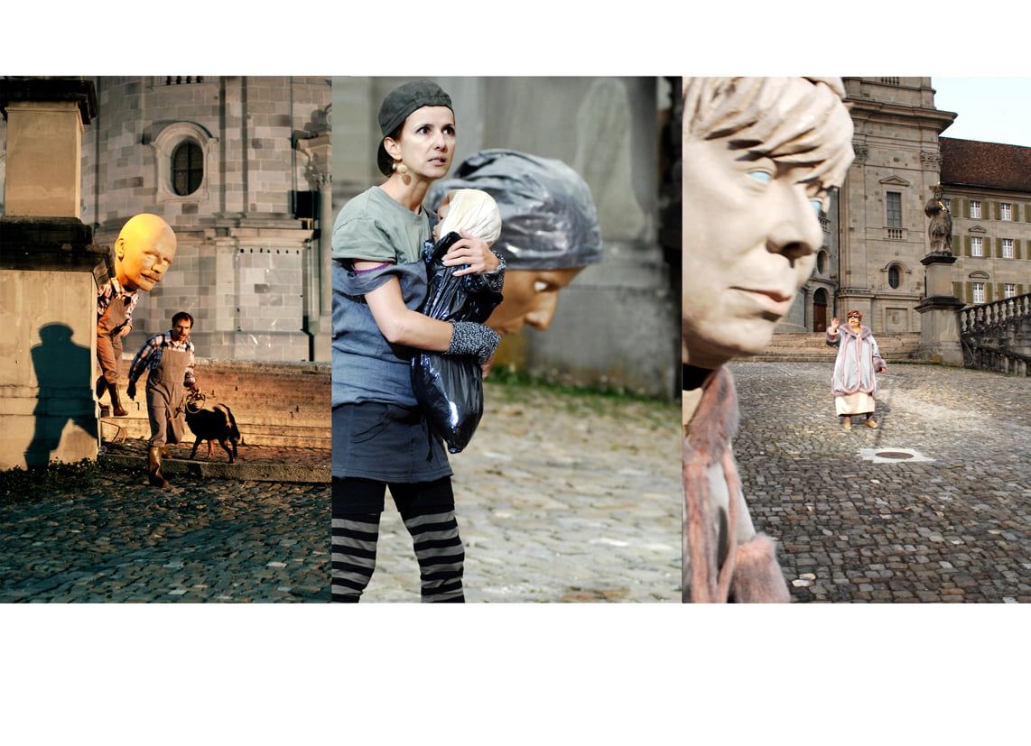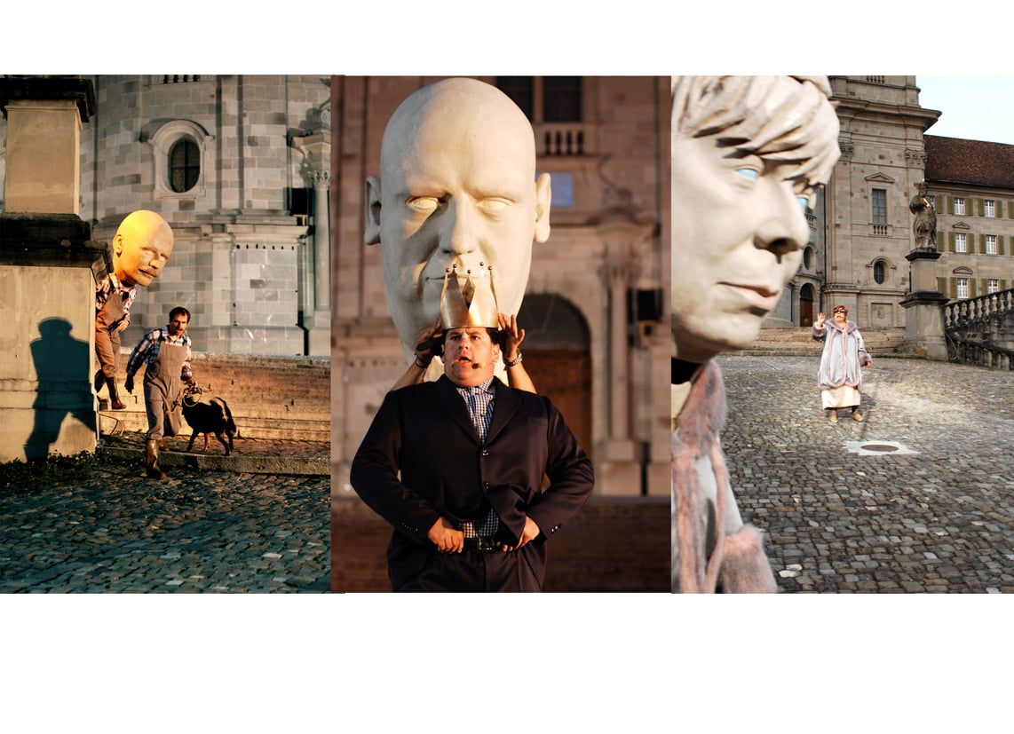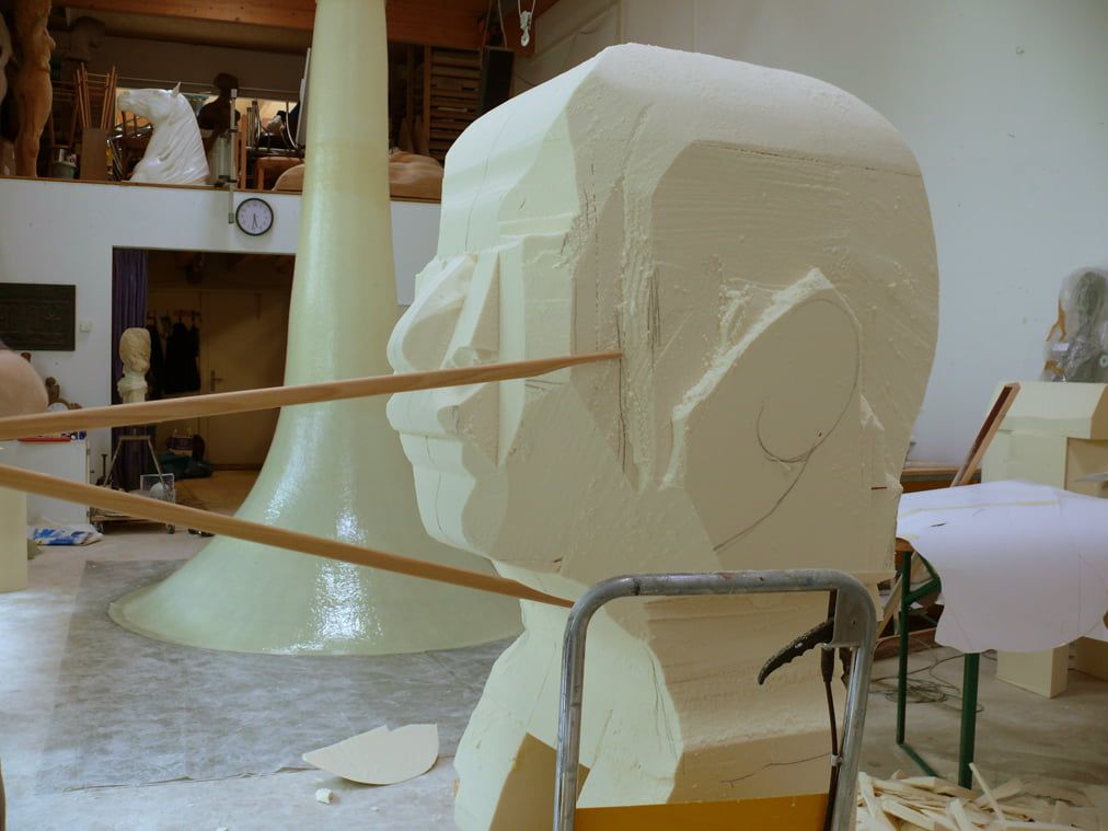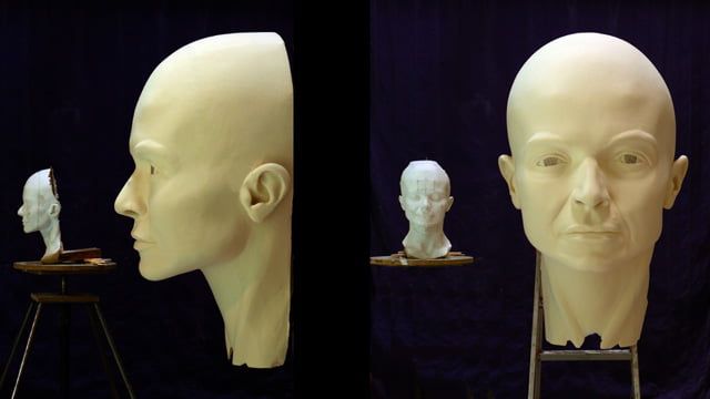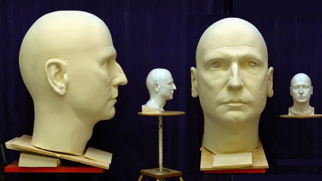 Auftrag: Sechs 1m hohe Porträt-Köpfe schnitzen und aushöhlen. Als Vorlagen dienten Gipsabgüsse vom jeweiligen Schauspieler. Jeder Kopf sollte einen vom Regisseur festgelegten Ausdruck besitzen.
